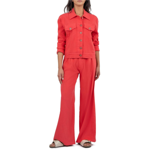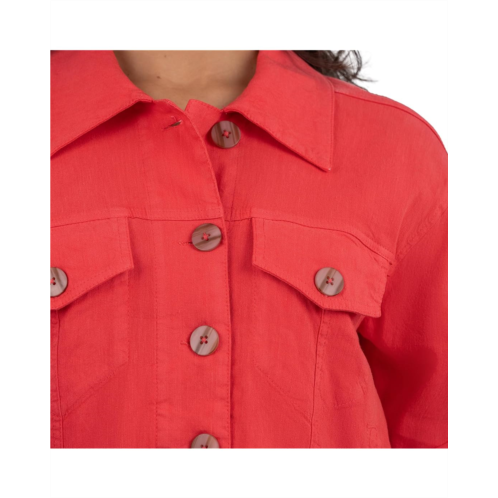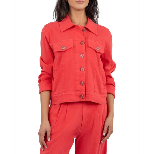 Top your look off with the KUT from the Kloth Julia - Semi Fit Linen Jacket featuring flap patch pockets that make this the perfect everyday jacket. The buttoned front closure ensures easy wear while the linen blend fabric makes it comfortable for all-day wear. This slightly cropped denim jacket is styled with long sleeves, a collared neckline, and a straight hem.