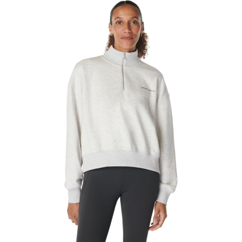 Head out for a casual run or train comfortably wearing the Sweaty Betty Revive Crop 1/2 Zip Pullover. A fresh take on our elevated half-zip sweatshirt, the pullover for women is made from a soft and breathable cotton blend. It features a mock neck, half-zip closure, dropped shoulder design that falls to the top hip, long sleeves, and ribbed details at the cuffs, neck, and waistline. The brand logo detail at the left chest adds an authentic touch.