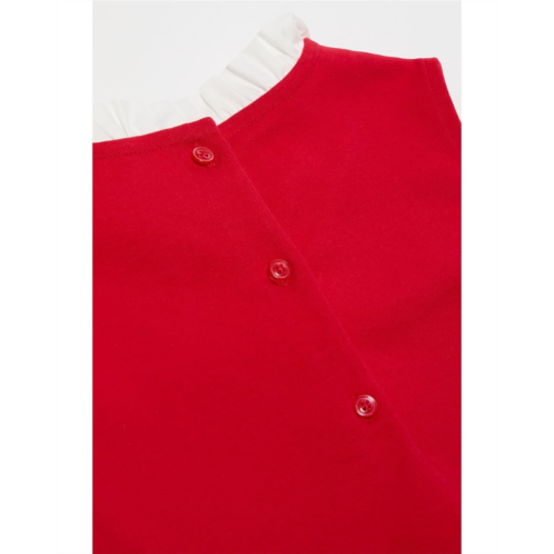 - Cute in look and comfy in feel, the Janie and Jack Ponte Knit Dress is something your little one will love. The pull-on style dress with contrasting details features a crew neck with frills and a cute bow motif. It comes in a sleeveless design and a knee-length silhouette. The back-button closure ensures a snug fit.