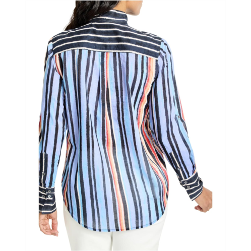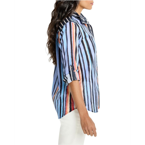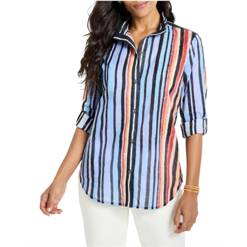 Style up your casual or formal looks wearing the NIC+ZOE Painted Peninsula Cotton Shirt. The shirt comes in a placed print with every stripe put exactly where it's meant to be, including a reversed horizontal stripe detail on the inside of the cuff. It features a stand collar, long sleeves with buttoned cuffs, full button-front closure, and a shirttail hem that sits slightly below the hip.