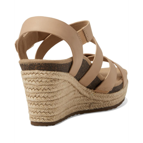 The Aetrex Anna wedge heeled sandals feature ankle strap buckle with hook-and-loop closure, open round toe design, and brand detailing on the footbed. It has leather upper and suede insole.