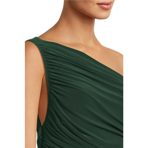 - Single-shoulder gown flaunts ruching throughout the side seams for an allover gathered effect.