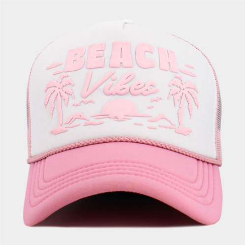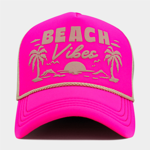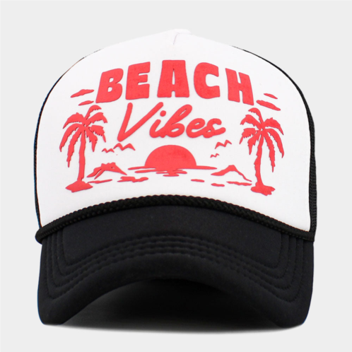 Crown Circumference - 23' (Adjustable)Crown Height - 4.5'Brim Height - 2.7'Material - 55% Cotton, 45% PolyesterCapture the spirit of endless summer with our “Beach Vibes” trucker hat, featuring a retro palm tree and sunset print in soft pink on a bold black front. The breathable beige mesh back and adjustable snap closure offer a comfortable fit, making it the perfect accessory for beach days, road trips, festivals, or everyday casual wear with a laid-back coastal feel.