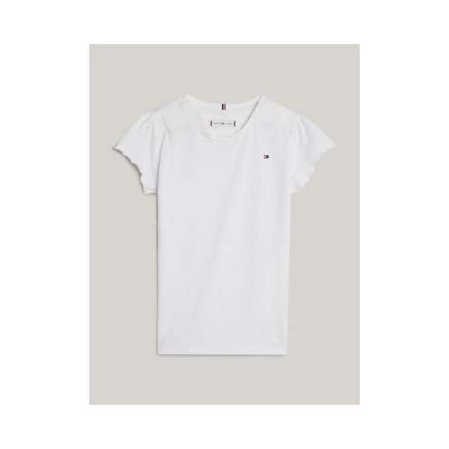 Tommy Hilfiger girls' top. This slim-fit tee is crafted from smooth cotton-blend jersey, with delicate ruffled sleeves for a pretty finishing touch. Part of our Adaptive Collection, designed for ease of dressing in classic Tommy style.