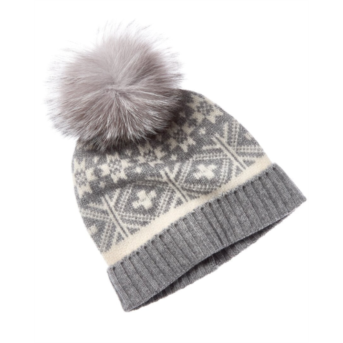 Introducing the sofia cashmere Fairisle Wool & Cashmere-Blend Hat, a luxurious addition to your winter wardrobe. This exquisitely crafted hat features a Fairisle design in a stylish heather grey multicolor, complete with a fluffy fox pom pom for added flair. Made with 90% wool and 10% cashmere, this hat is both cozy and chic. Measuring 8 inches long when cuffed and 9.5 inches wide, it is the perfect accessory to keep you warm during the cold months. Elevate your winter look with this sophisticated hat, featuring real fox fur details. Dry clean only. Imported.