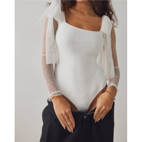 Form fitting and comfortable - this bodysuit check all of the boxes.Details -Fabric - Soft, stretchy fabrication. Classic scoop neckline. Long sheer sleeves with adjustable bowtie detailing. Snap-button closure. Model is 5'8 | Wearing a S. 88% Nylon, 12% Spandex. Machine Wash Cold