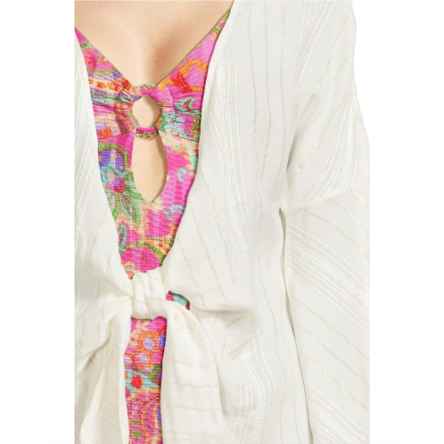 Plunge into the warmer weather with woven Radiance Plunge Tie Front Tunic from BECCA. Tie front tunic with adjustable scarf tie for a custom fit. Textured woven metallic stripes.