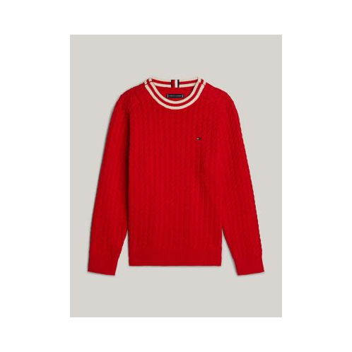 Tommy Hilfiger boys' sweater. This pure cotton sweater is a timeless choice for chilly days, thanks to its classic cable knit design and contrast detailing. Part of our Adaptive Collection, designed for ease of dressing in classic Tommy style.