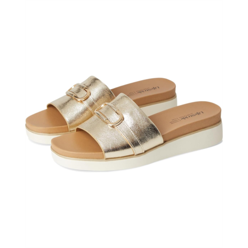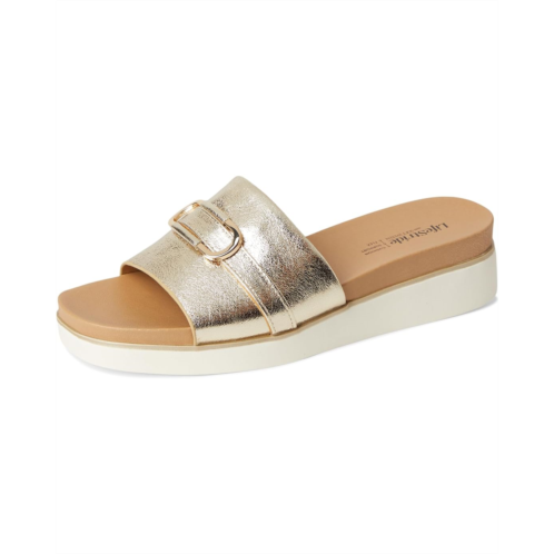 Effortless chic, redefined: LifeStride Genevieve effortlessly blends casual comfort with refined style. These chic slide sandals are designed with faux leather or woven fabric, a soft square open toe, and a slip-on fit that makes getting ready a breeze. The metallic ornament detail adds just the right touch of glam to elevate any outfit, from laid-back weekends to evening strolls. Crafted with Soft System comfort technology, the foam insole and synthetic rubber outsole provide unbeatable cushion, support, and flexibility. The traction sole ensures stability with every step, while the partially recycled linings offer eco-friendly appeal. These slides are the perfect blend of fashion and function, ready to complete your closet essentials.