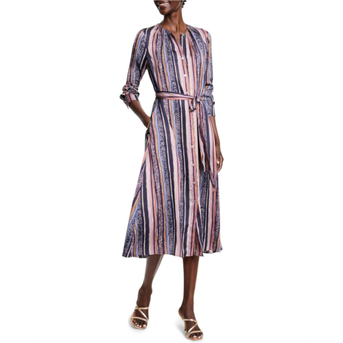 Taking a walk on the wild side has never been so chic, or so comfy. This versatile NIC+ZOE Animal Stripe Loren shirt dress can be worn open over a tank or tee, or cinched at the waist for a more polished look. The feminine shirring detail around the neck adds a touch of elegance, while the two side seam pockets keep your hands free. Designed to flatter, the Loren Dress is perfect for transitional weather and will quickly become a wardrobe staple. Made from recycled Pottery Crepe fabric with a buttoned front fastening and a hem that falls below the knee. With pockets!