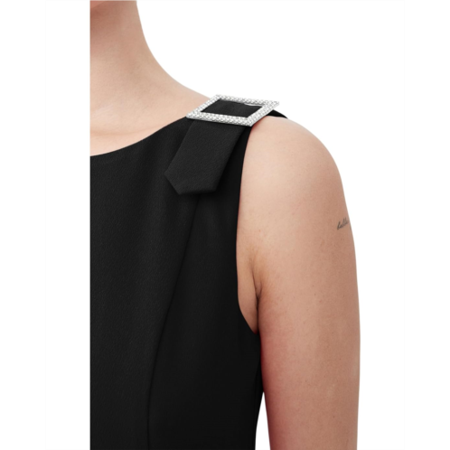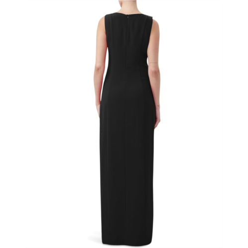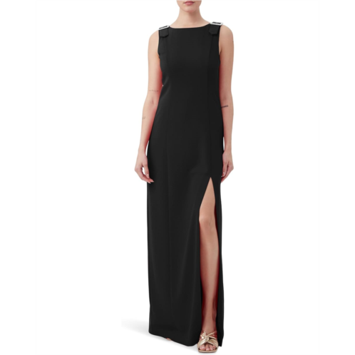 The Trina Turk Nevie Dress boasts a sleeveless design with maxi silhouette and knee-high slit for ease of mobility. It has a boat neckline with rhinestone belt buckle detail at the shoulders.