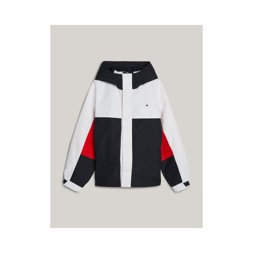 Tommy Hilfiger boys' jacket. Go for an eye-catching cold-weather look in this jacket, featuring a statement colorblock design and a cozy hood. Part of our Adaptive Collection, designed for ease of dressing in classic Tommy style.