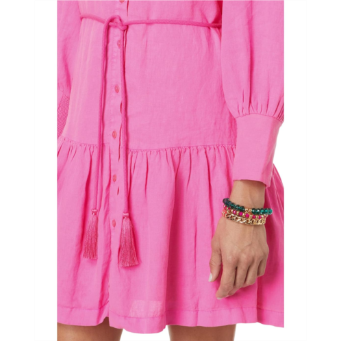 Lilly Pulitzer perfection, the Drena Linen Dress. This easy-fit shirtdress features a sophisticated stand collar and a full button placket, offering a classic fit that's both flattering and versatile. Long quarter length sleeves with tall cuffs and a playful hem ruffle add a touch of charm, while the separate rope belt with tassel cinches your waist for a defined silhouette. Perfectly above the knee, this dress is designed to keep you cool and stylish from day to night, making it your go-to for any occasion.