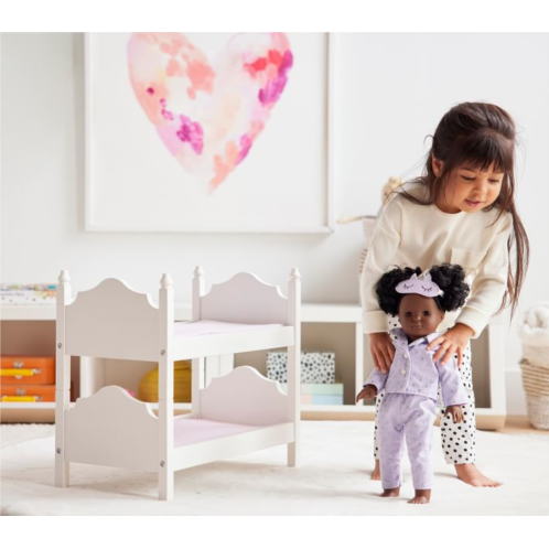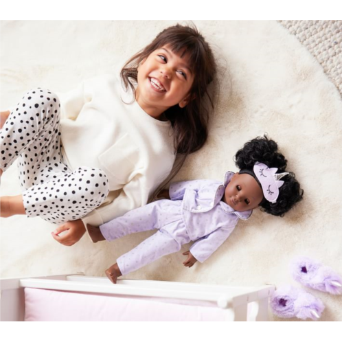 - Six piece set includes doll, pajama top, pajama pants, sleeping mask, slippers and a unicorn sleeping bag.