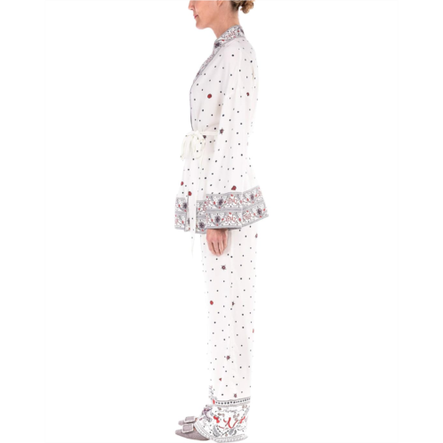 The Badgley Mischka Bon Voyage Boarder Print Kimono will allow you the most heavenly of restful days and nights, enveloped in luxurious comfort. Crafted for an all day/night style and comfort this kimono features a Bon Voyage inspired design on lining of cuffs, hem, and neckline, open construction with a tie-knot waist belt closure, long sleeves, and a straight hemline.