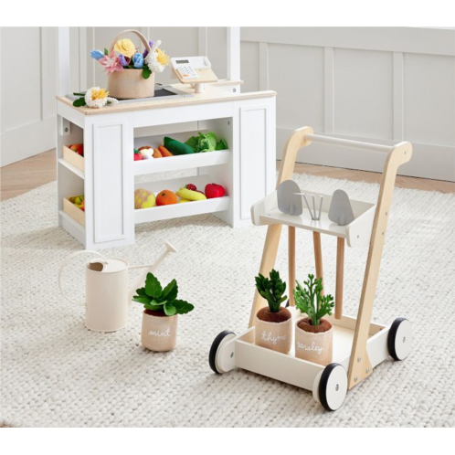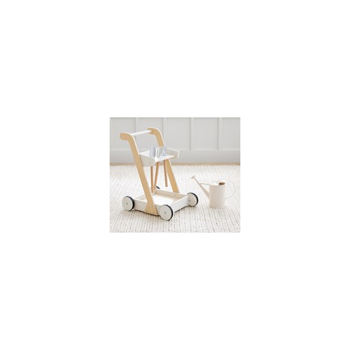 Great for encouraging green thumbs, our gardening cart gives them all the tools of the trade in one kid-sized set. Crafted of wood with metal accents, the cart features two shelves that hold a rake, shovel, spade and water can for pretend planting indoors or out. Fit with handles and wheels, it lets them practice balance and push and pull.