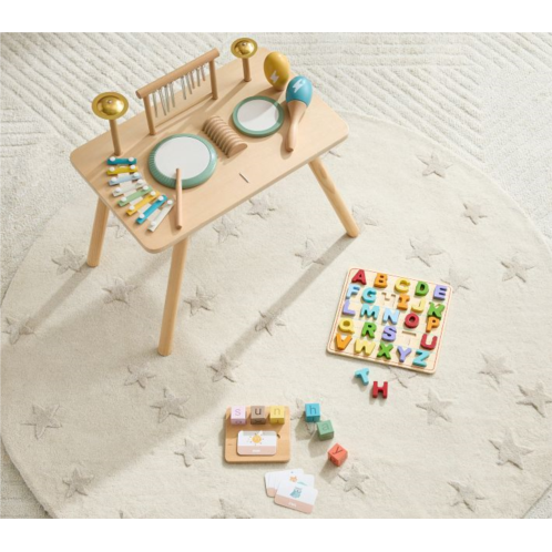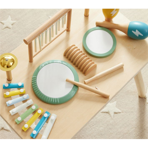 Mini Mozarts will find endless musical inspiration with our interactive board. Crafted of wood and made for creative, hands-on play, the table design comes with a kid-sized drum, xylophone, bells, maracas and hanging chimes to help develop their fine motor skills and sense of rhythm and hearing.