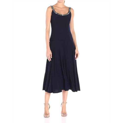 Sparkling beads embellish the scooped neckline of a drop-waist dress fashioned with a slightly flared tea-length skirt.