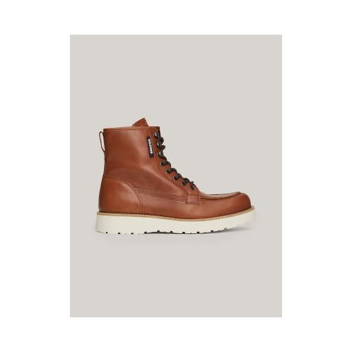 Tommy Hilfiger men's boot. These workwear-inspired boots sit on raised outsoles made from lightweight rubber, while smooth leather and refined detailing counter the rugged silhouette.