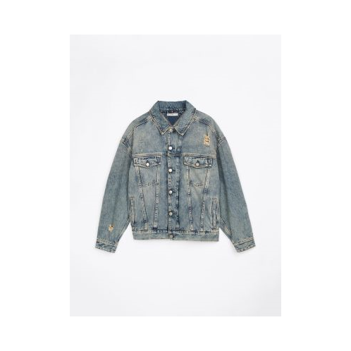 - Distressing at chest and sleeve, functional top snap, two flap chest pockets, two waist welt pockets, dropped shoulders.