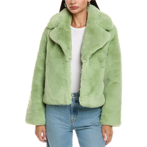 Introducing the Apparis Miller Short Coat, a must-have for your outerwear collection. This luxurious faux fur coat features a unique Matcha color/pattern that adds a touch of elegance to any outfit. With a notched lapel, two front pockets, and a hook-and-eye front closure, this coat combines style and functionality. Made from 100% recycled polyester, this coat is not only chic but also environmentally friendly. Perfect for chilly days and nights, the Apparis Miller Short Coat is a statement piece that you'll reach for again and again. Dry clean only. Imported. Model is 5'9' and is wearing a size small. Measurements may vary slightly by size.