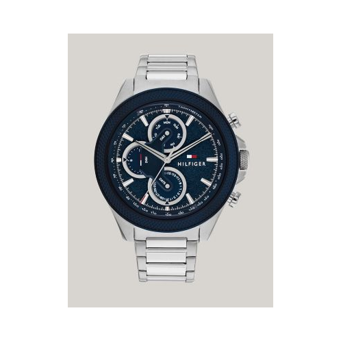 Tommy Hilfiger men's watch. Make a statement in our bold sport watch. This timepiece is defined by its race-inspired, guarded, multi-layer sub-dials, a knurling textured bezel and crown, and a comfortable integrated stainless steel bracelet.