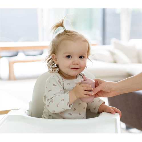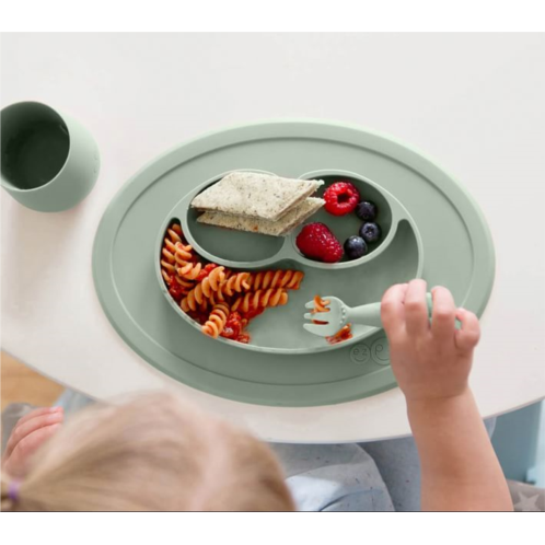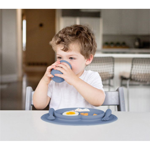 The Mini Mat is an all-in-one placemat and on-the-go plate that helps infants and toddlers self-feed. The lidded cup and straw keep liquids secure while the stable base of the mat suctions right to the table to reduce tipping.