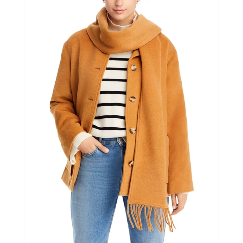 The coolest, most versatile utility jacket. Match it with your favorite pair of denim or throw it over any day dress.Introducing the Women's Scarf Collar Coat by AQUA, a stylish coat in a textured camel hue. This coat features long sleeves, a round neck with a detachable snap-off scarf with fringe trim, and front patch pockets for added utility. Made from a blend of 64% polyester and 36% wool, with a 100% polyester lining, it offers both warmth and elegance. Closure is secured with front buttons, and care is as simple as dry cleaning.