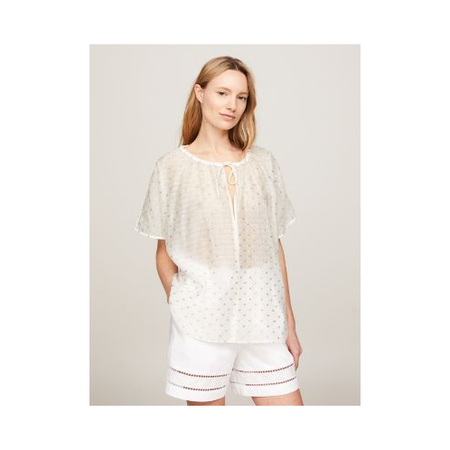 Tommy Hilfiger women's top. This sweet summer top is designed with a drawcord neckline and cap sleeves. Using a 'cut thread' embroidery technique, the allover shimmer embellishments have a subtle fringe, adding understated texture.