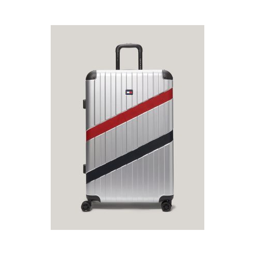 Tommy Hilfiger luggage. Our upright roller suitcase stands out on the carousel in signature Tommy stripes. Constructed of durable composite polycarbonate material ready to take on the rigors of travel. Four multi-directional spinner wheels provide effortless rolling to make traveling a breeze.