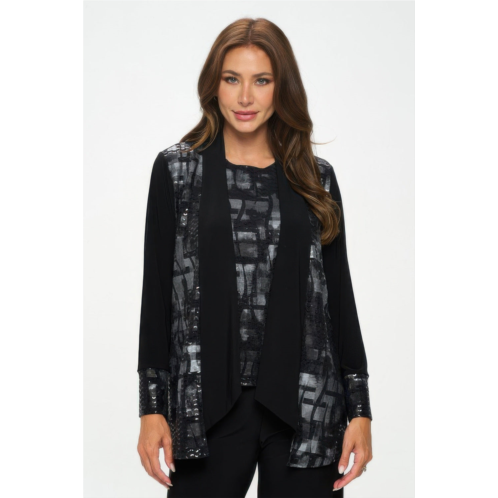 Shine bright in this modern tank top designed with contrast and texture in mind. The front showcases a radiant metallic foil finish, while the black back panel ensures all-day comfort and effortless pairing. Crafted from a flexible fabric blend, it hugs comfortably without clinging. Ideal for dressing up jeans or layering under blazers, this tank is a statement piece that remains wearable.
