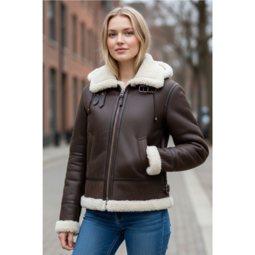 [US] Infinity Leather womens creck brown hooded sheepskin flying bomber Leather jacket - sovereign