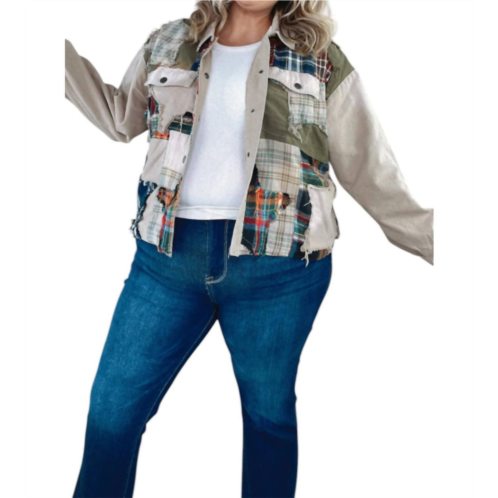 A casual yet cool jacket that every closset needs.Care Free Plaid Patch Button Down Jacket by Oli & Hali Long sleeve khaki jacket Unique plaid patchwork design Edgy vibrance Casual outfit 100% cotton Relaxed fit Comfort and durability Button closure Collar neckline Lay flat to dry