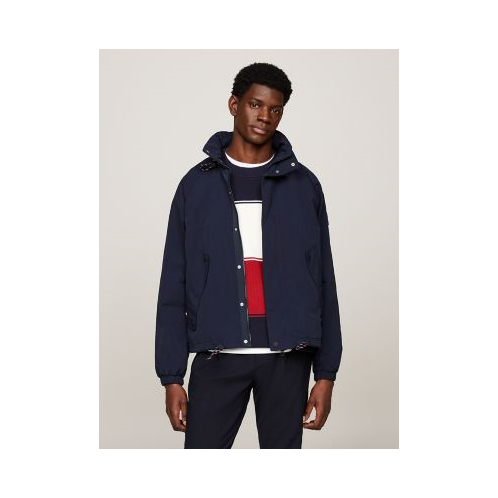 Tommy Hilfiger men's jacket. When the weather won't quit, our high-neck hooded windbreaker is at the ready. Crafted from water-repellent recycled nylon, this outer layer features toggle cords on the collar and hem that help you stay warm on breezy days, and dry on rainy ones.
