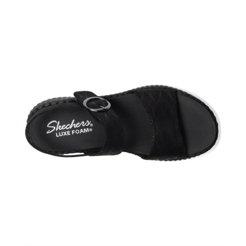 Enjoy sunny days in breezy comfort with Skechers Wilshire BLVD - Illusion of Love. Crafted from textured vegan shimmer suede upper with adjustable strap and buckle, this pair of sandals features open round toe, luxe foam cushioned comfort footbed, midsole stitching trim, low heel, and brand detailing on the footbed.