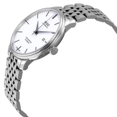 Stainless steel case with a stainless steel bracelet. Fixed stainless steel bezel. White dial with silver-tone dauphine-style hands and index hour markers. Minute markers around the outer rim. Dial Type: Analog. Date display at the 3 o'clock position. Mido calibre Powermatic 80 (ETA C07.621) automatic movement, based upon ETA 2824-2, containing 23 Jewels, bitting at 21600 vph, and has a power reserve of approximately 80 hours. Scratch resistant sapphire crystal. Pull / push crown. Transparent case back. Round case shape. Case size: 40 mm. Case thickness: 9.43 mm. Band width: 20 mm. Fold over clasp with a push button release. Water resistant at 30 meters / 100 feet. Functions: date, hour, minute, second. Baroncelli iii series. Casual watch style. Watch label: Swiss Made. Mido Baroncelli III Automatic Men's Watch M027.408.11.011.00.