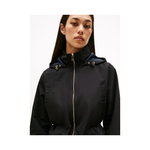 Tommy Hilfiger women's jacket. Our lightweight storm jacket keeps you covered, thanks to the longline silhouette and bungee drawstring hood. Elastic cuffs and and a channeled bungee waist protect from cool breezes during transitional weather days.