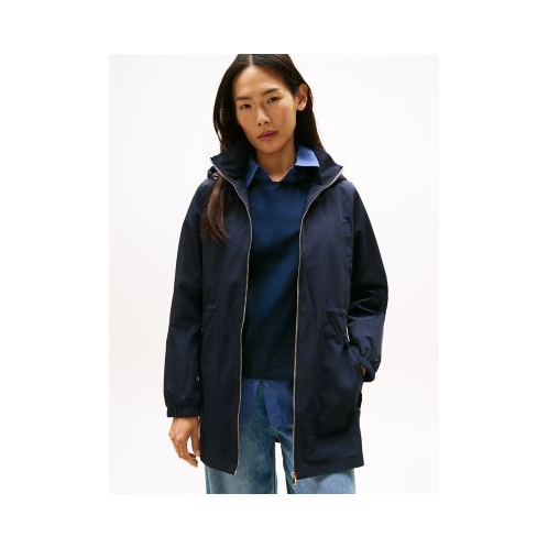 Tommy Hilfiger women's jacket. Our lightweight storm jacket keeps you covered, thanks to the longline silhouette and bungee drawstring hood. Elastic cuffs and and a channeled bungee waist protect from cool breezes during transitional weather days.