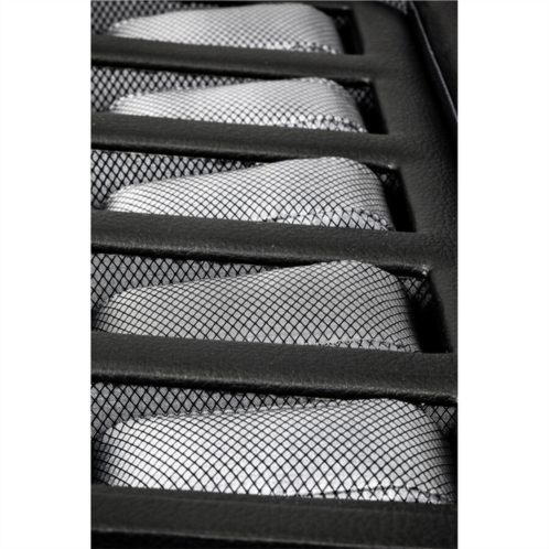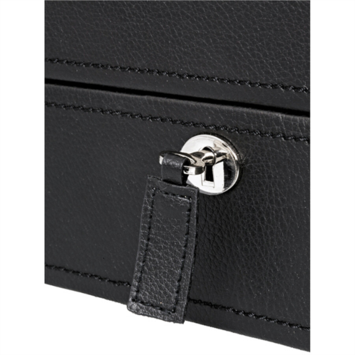 This black watch storage box holds up to five quartz or mechanical watches, and is portable enough for home or away. Part of Wolf 2009-2010 Watch Box Collection, this item is made of a solid wood construction, encased in a new supple pebble finish textured material, and lined with a silver textured silk fabric. It has a sturdy see-through tempered glass lid and comes with a lock and key. Holds up to five watches and, with 1.5 (55mm) between each cuff, this compact yet spacious case can accommodate any size watch - even the largest 52mm case! Dimensions: 12.25 w' x 5.5 d' x 3.75 h'.