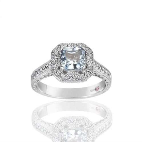 Enjoy beachy blues all year long with light blue aquamarine cubic zirconia hues. This Suzy Levian Ring features a assher-cut light blue aquamarine cubic zirconia center stone that is surrounded by a halo of white cubic zirconias, hand-set in sterling silver. This ring is designed by Suzy Levian with a message. By creating jewelry that is beautiful inside and out, Suzy Levian's message is revealed through a hidden secret stone set in the shank of this ring to empower women to discover their inner strength, power and beauty. This ring has a closed undergallery with a golden SL logo to highlight Suzy Levian's signature stamp. 'Together we can inspire the world to appreciate the diamond in ourselves.' - Suzy Levian