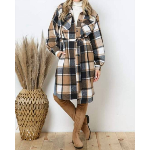 Cute, casual, and comfortable. This jacket is a must have.Discover the Neive Plaid Tie Front Shacket by Blue B, perfect for versatile styling. With long sleeves crafted from 100% polyester, this shacket offers ultimate comfort and softness. Designed as a shirt dress or jacket, it features a taupe plaid pattern with practical details like two chest pockets with flaps and a button closure, complete with a matching belt for an adjustable fit. Ideal for casual outings, this women's jacket brings effortless style to your wardrobe.