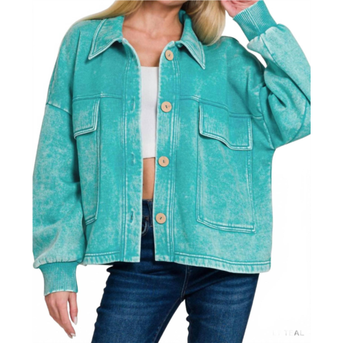 [US] ZENANA acid wash fleece cropped shacket with front pockets in light teal