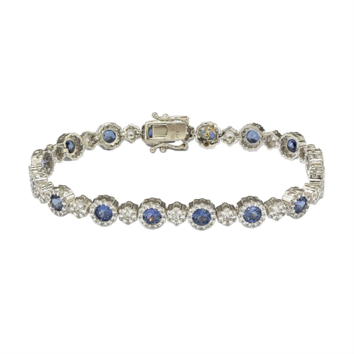 Discover the exquisite beauty of the Suzy Levian Women's Sterling Silver Tennis Bracelet, a stunning piece designed to elevate your jewelry collection. This bracelet features a breathtaking arrangement of rich blue sapphires totaling 5.44cttw, elegantly prong set in a halo of created white sapphires (0.96cttw). The unique design is enhanced by delicate flower clusters of created white sapphires (0.84cttw) that connect each sapphire, creating a captivating visual effect. With a total of 7.24cttw of sparkling sapphires, this bracelet is a true embodiment of timeless elegance. It is finished with an 18k yellow gold SL logo and showcases a Suzy Levian Secret Signature brown diamond in the back gallery, symbolizing the encouragement for women to embrace their inner beauty. Perfect for any occasion, this tennis bracelet is a luxurious accessory that will leave a lasting impression.