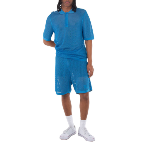 Burberry Men's Bottoms. SKU - 8071625. Material - Polyamide;Viscose. Color - Bright Cerulean Blue. Burberry Rory EKD Mesh Shorts. shorts with mesh detailing and a semi-sheer construction. They feature a signature Equestrian Knight motif, an elasticated waistband, and a knee-length cut. 48% Polyamide, 52% Viscose.