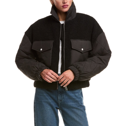 Introducing the LAMARQUE Peyton Mixed Media Bomber Jacket, a sleek and stylish addition to your outerwear collection. This black jacket features a spread collar, front flap pockets, and elastic cuffs for a trendy look. The zipper front closure adds a modern touch, while the 100% polyester material ensures comfort and durability. Measuring approximately 19 inches from shoulder to hem, this jacket is perfect for layering over your favorite outfits. The model is 5'9.5' and is wearing a size small, but please note that measurements may vary slightly by size. Machine washable and imported, this LAMARQUE bomber jacket is a must-have for any fashion-forward woman.
