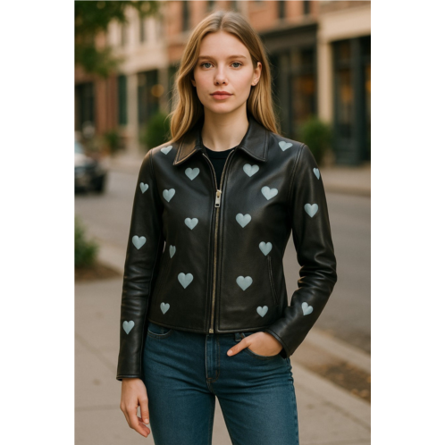 Crafted from premium lamb leather, this women’s biker jacket combines edgy style with playful heart appliques. Featuring a slim fit, cotton lining, and four practical pockets, it’s a chic blend of comfort and elegance for casual and statement outfits.Key Features - Premium quality lamb leather constructionStylish slim fit design for a flattering silhouetteUnique light blue heart applique detailingComfortable cotton lining for breathable wearFront zip closure for a sleek finishTwo outer and two inner functional pocketsClassic biker-inspired look with a modern twistDurable and versatile for everyday wear
