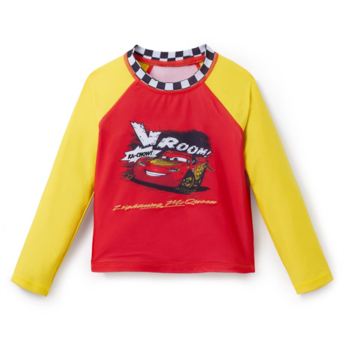 They'll speed through clear waters safely when wearing this rash guard featuring the screen art ofCarsPiston Cup champion, Lightning McQueen. Just like Lightning's competition on the track, the sun doesn't stand a chance against the UV protection of this essential long-sleeve swim top.