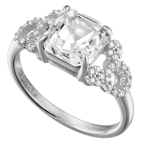 An eye-catching Swarovski Fancy Imperial Cut square stone is surrounded by sparkling clear cubic zirconia stones in a Mickey Mouse icon design on this solitaire ring by Rebecca Hook. The band is crafted from polished sterling silver that enhances the shine and elegance of this stunner.