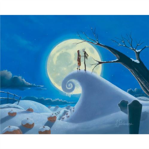 The frosty setting of Halloween Town's Spiral Hill provides the setting for this warm-hearted romantic work by Michael Provenza. Jack Skellington and Sally are pictured holding hands on a moonlit scene inspired byTim Burton's The Nightmare Before Christmas. The limited edition ''Winter Romance'' comes gallery wrapped and ready to melt hearts!