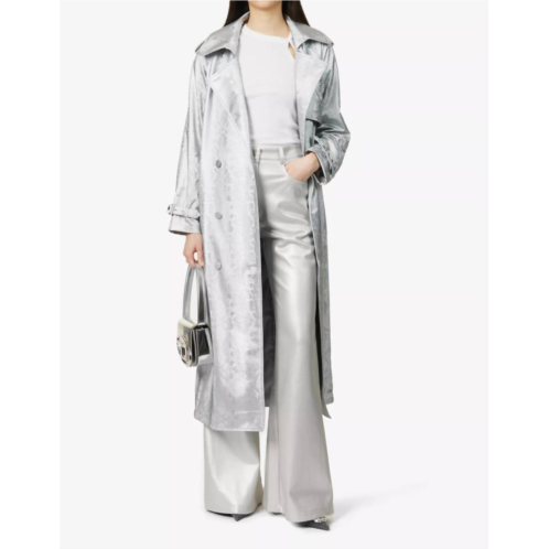 A timeless classic. You'll be reaching for this trench every season.Standout piece that exudes modern sophistication with its metallic finish. Silver faux leather trench coat. Featuring wide lapels and a double-breasted, button closure for a secure fit. Composition - 50% Polyester, 50% Polyurethane, with a 100% Polyester lining. Length - 48in/122cm. Machine wash cold. Practical details include buttoned shoulder straps, buckle straps at sleeve hems, and angled slip pockets.